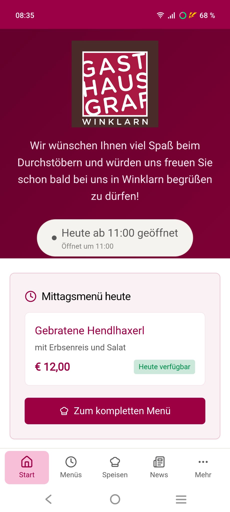 Mit unserer Gasthaus Graf-App haben Sie alles im Blick: das tagesaktuelle Mittagsmenü, unsere Speisekarte, alle Events, direkten Kontakt – und natürlich die aktuellen Öffnungszeiten. Einfach auf dem Smartphone installieren und jederzeit griffbereit haben – schnell, flexibel und immer aktuell.